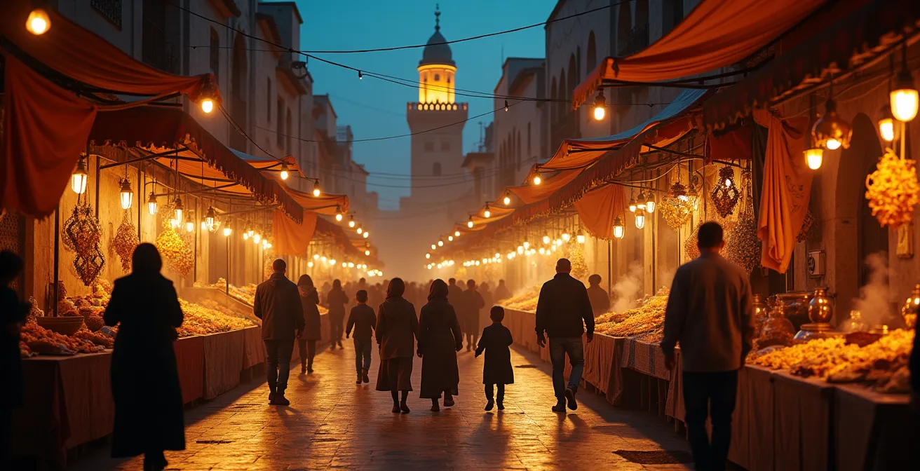 Cependant, dès que le coup de canon annonce la rupture du jeûne (*Ftour*), le pays opère une transformation spectaculaire. C’est là que se révèle le « meilleur » moment. Les rues s’animent d’une ferveur incomparable. Les familles se réunissent pour partager des repas copieux, et une atmosphère de générosité et de fête s’empare de l’espace public. L’activité nocturne, déjà intense en été, est décuplée. Comme l’illustre le marché de Bab Doukkala à Marrakech, l’affluence explose après le Ftour, créant une ambiance festive unique qui se prolonge bien plus tard que d’habitude.