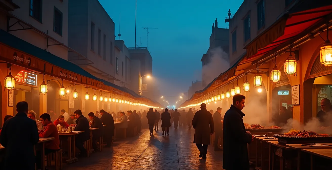 Cette effervescence nocturne est particulièrement visible sur les marchés et les places publiques. La place Jemaa el-Fna à Marrakech en est l’exemple le plus spectaculaire, mais ce schéma se répète dans toutes les grandes villes. Les stands de nourriture, qui tournaient au ralenti pendant la journée, s’illuminent de lanternes et les grills fument à plein régime pour attirer les foules. L’air se remplit des odeurs de mechoui (agneau rôti lentement) et de brochettes grésillantes. C’est à ce moment que la street food prend toute sa dimension de spectacle et de convivialité.